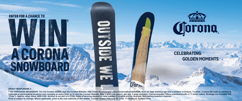 †NO PURCHASE NECESSARY. For full Contest details, visit the Contest Website: http://www.shopbeergear.ca/coronasnowboardetw2026. Must be legal drinking age and a resident of Ontario. To enter, i) scan a QR code on marketing materials at participating locations and complete an entry form; or ii) visit the Contest Website. Max. 1 entry per person, per day. 1 prize available: Corona branded 155cm snowboard with a 7.7 meter radius. Bindings not included (the “Prize”). Approx. retail value: $499 CAD. Alcohol is not part of a Prize. Odds of winning depend on total number of eligible entries received. Skill-testing question required. Contest closes: February 28, 2026, 11:59:59 p.m. Eastern Time